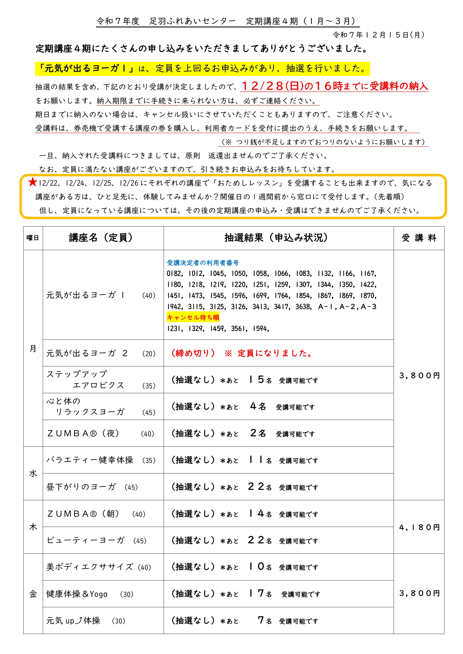 「元気が出るヨーガ1」につきましては、定員を超えるお申込みをいただき